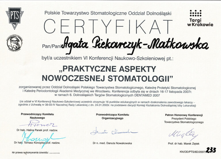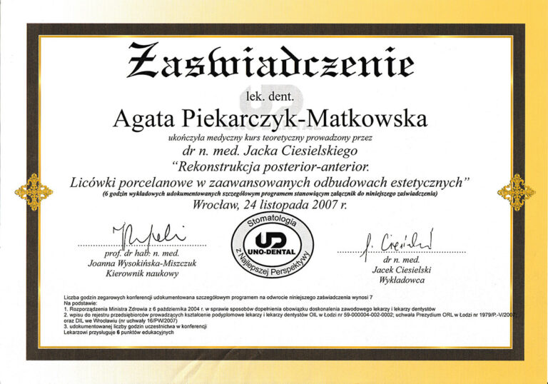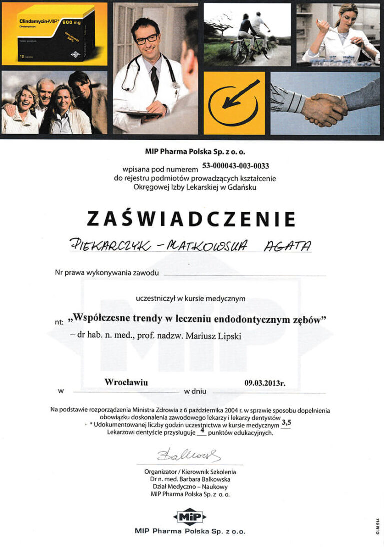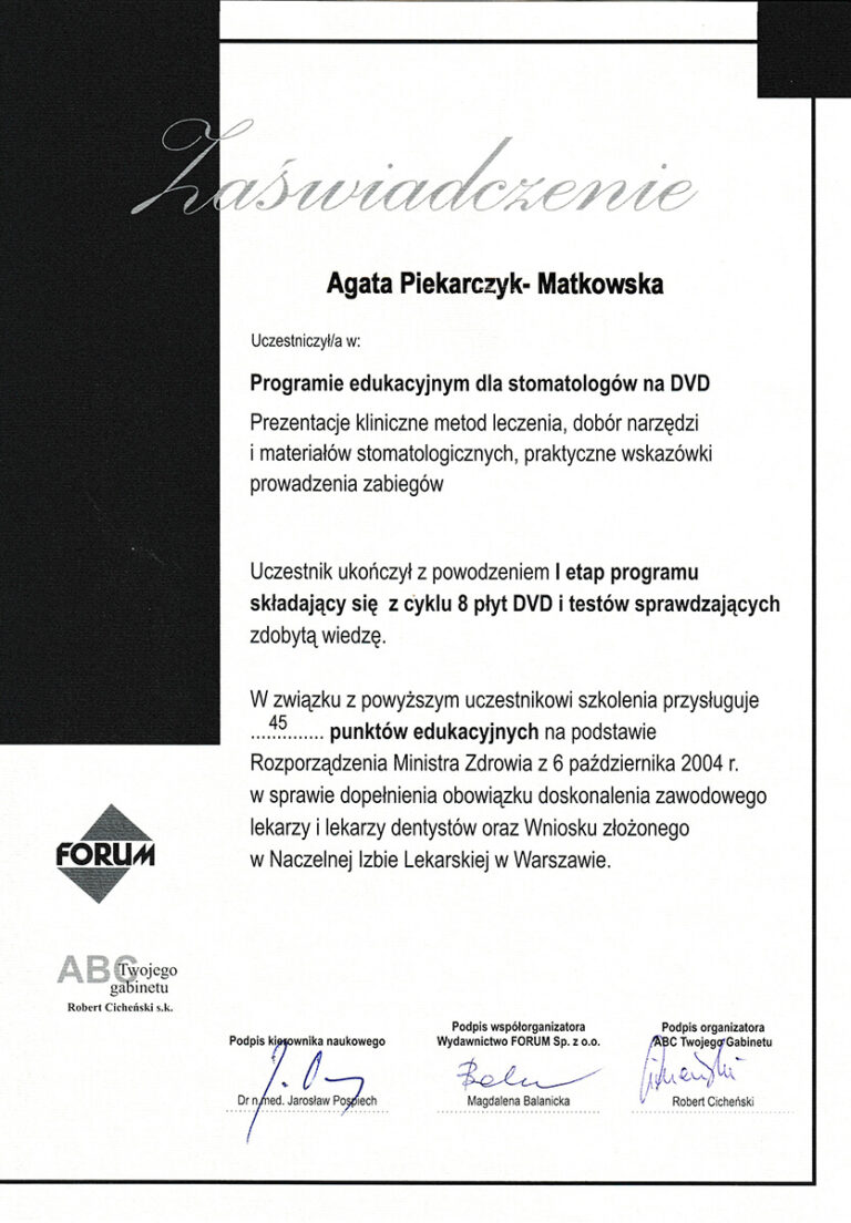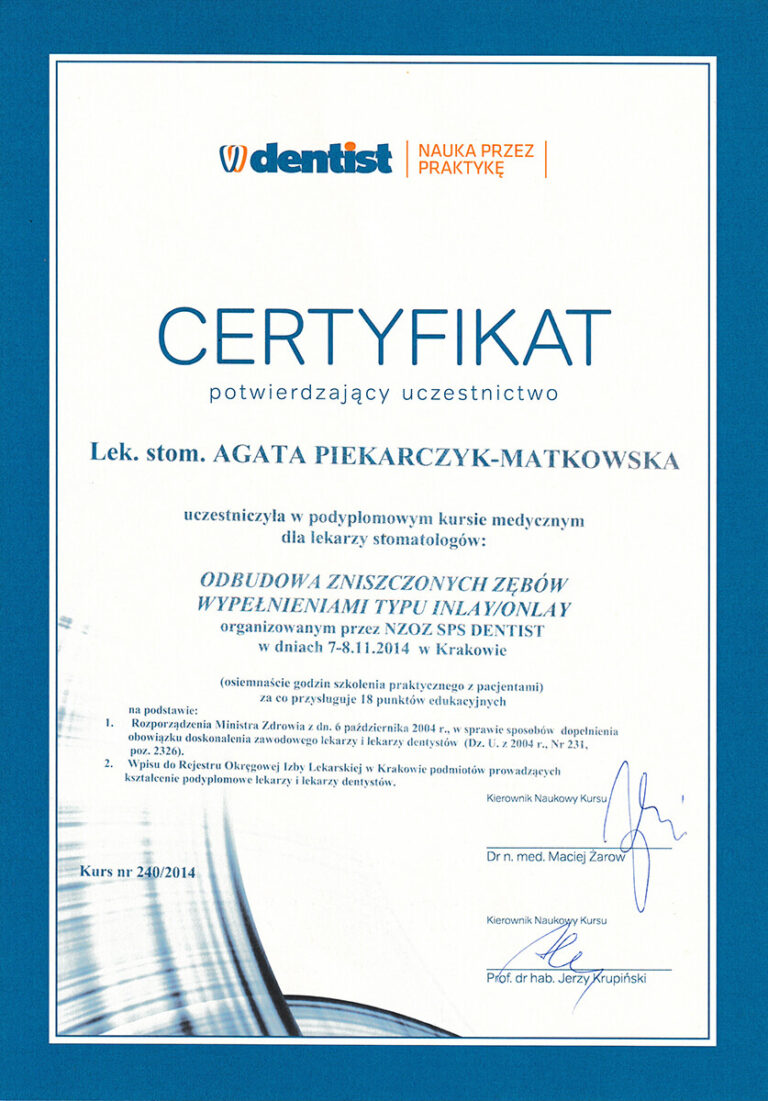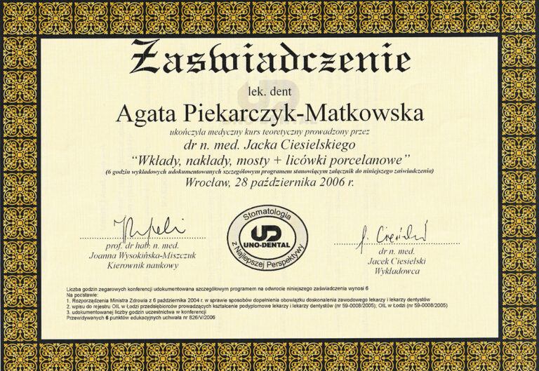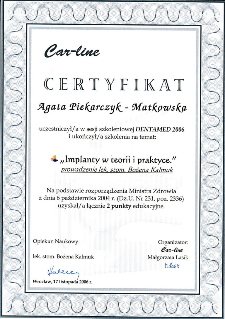 Jestem absolwentką Wydziału Lekarsko-Stomatologicznego Akademii Medycznej we Wrocławiu. Od 1998 roku prowadzę praktykę stomatologiczną, a w 2001 roku uzyskałam tytuł specjalisty w dziedzinie stomatologii ogólnej.