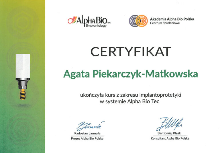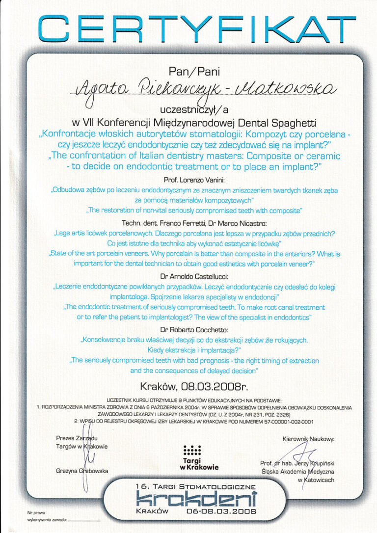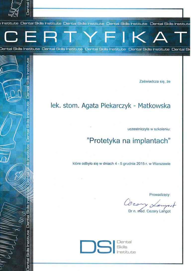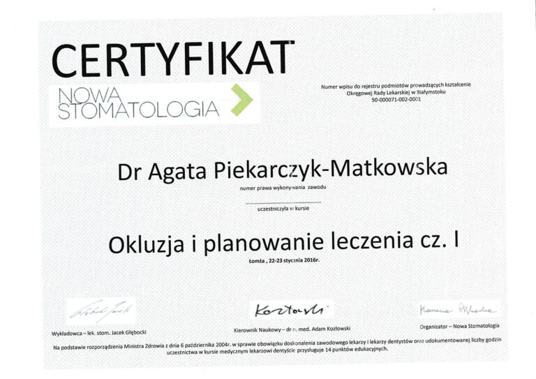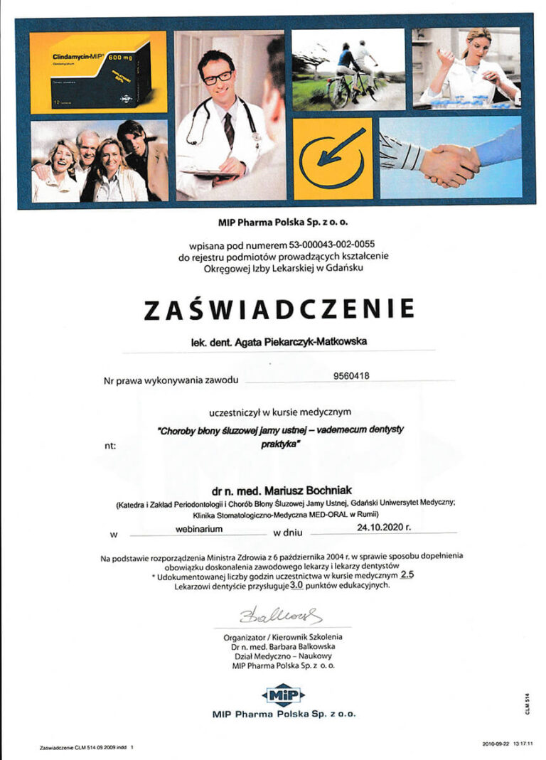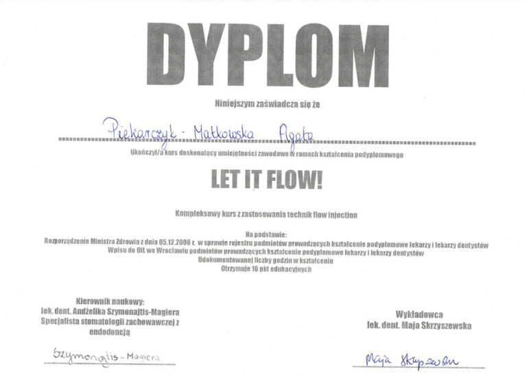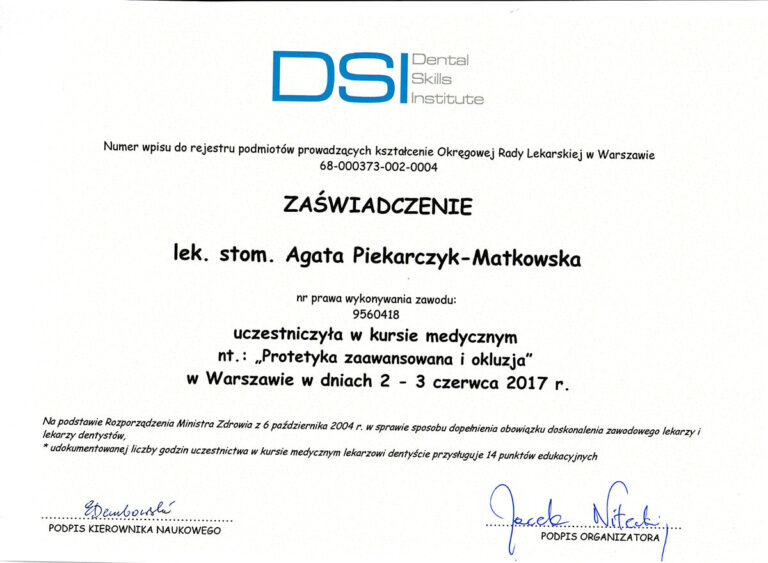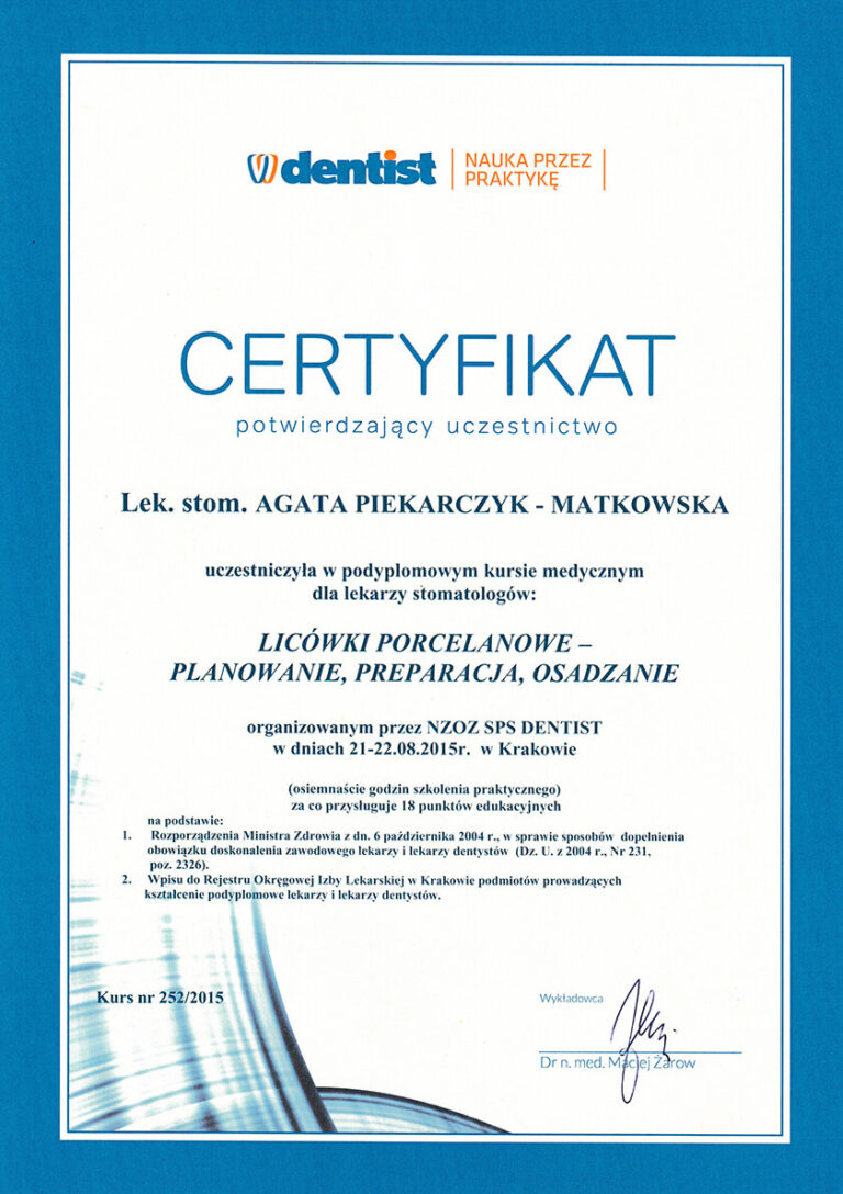 Jestem absolwentką Wydziału Lekarsko-Stomatologicznego Akademii Medycznej we Wrocławiu. Od 1998 roku prowadzę praktykę stomatologiczną, a w 2001 roku uzyskałam tytuł specjalisty w dziedzinie stomatologii ogólnej.