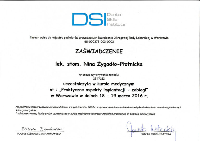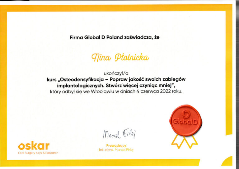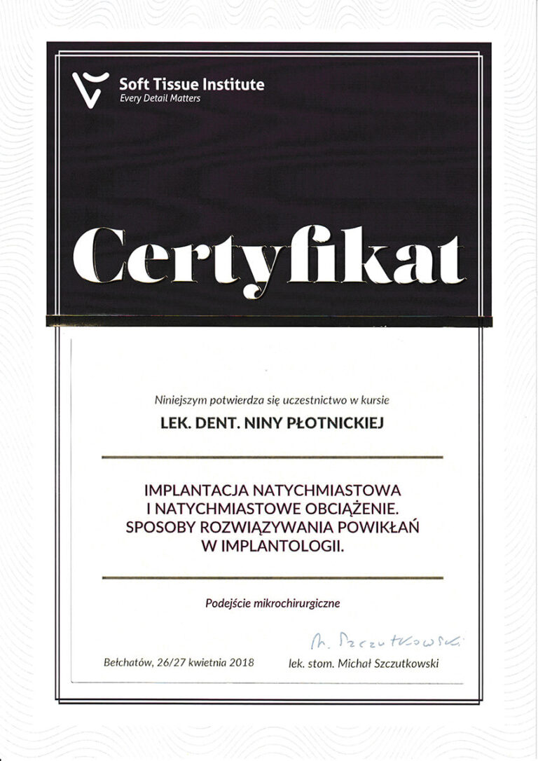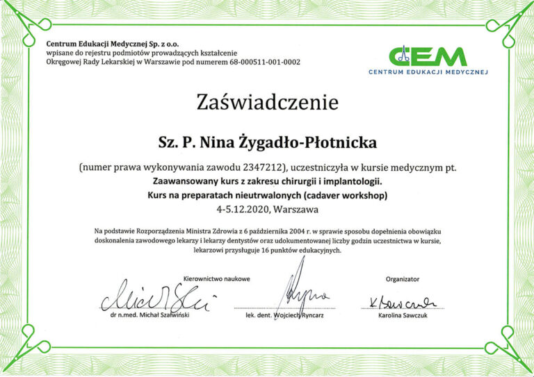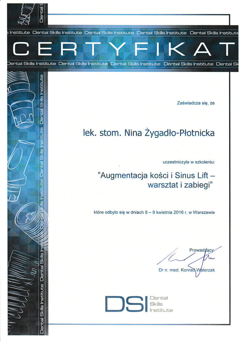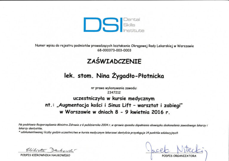 Jestem absolwentką Wydziału Lekarsko-Stomatologicznego Akademii Medycznej we Wrocławiu oraz specjalistką w dziedzinie chirurgii stomatologicznej. Moja pasja i doświadczenie koncentrują się na zabiegach z zakresu chirurgii oraz implantologii.